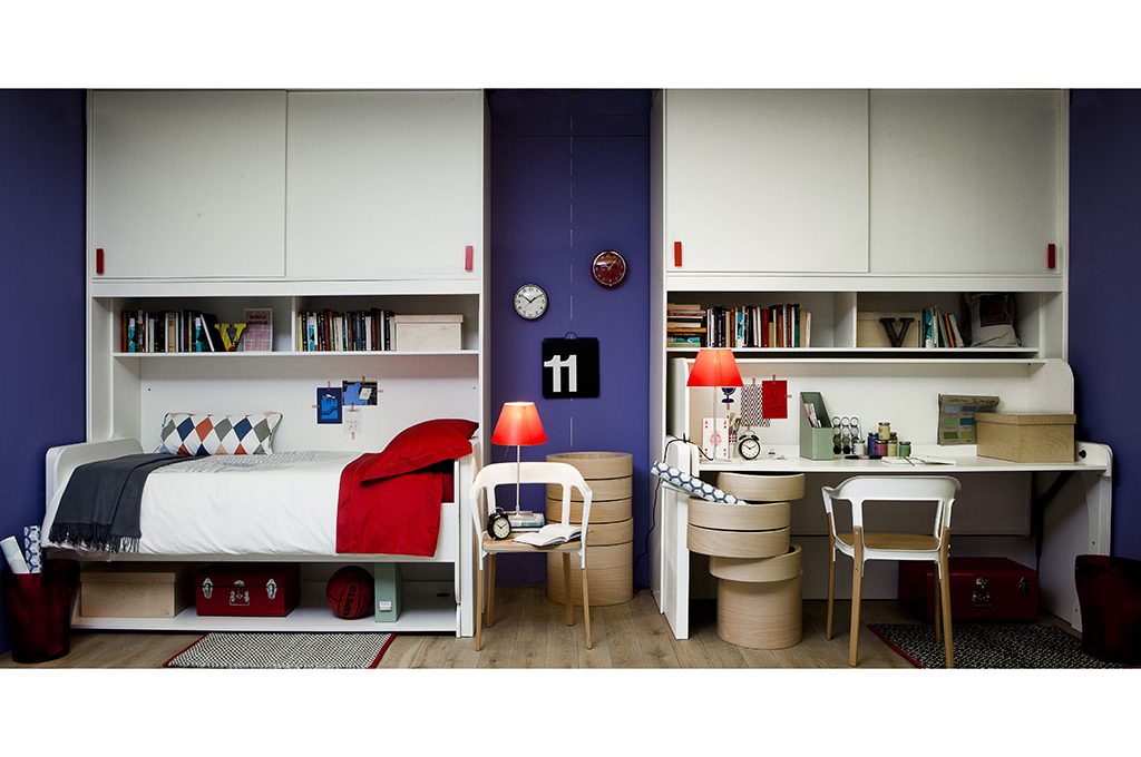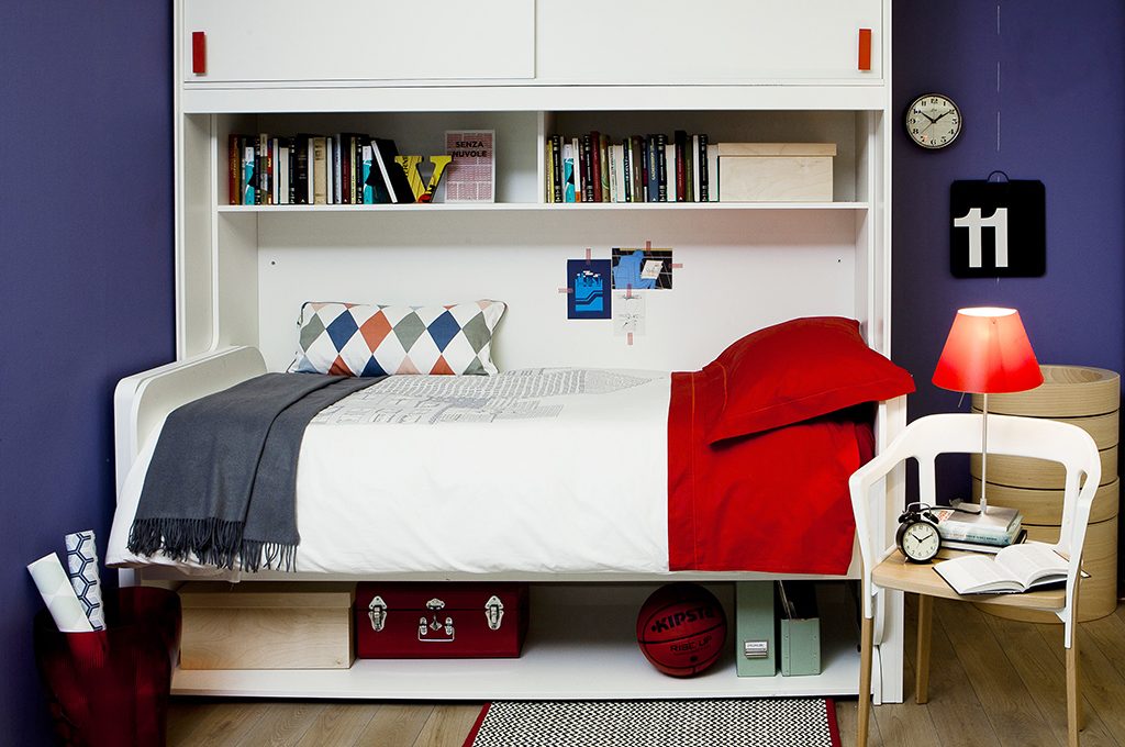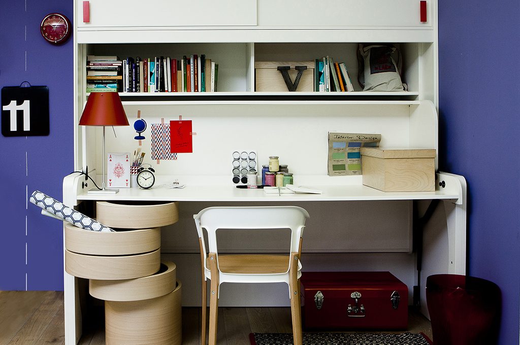 Piccoli spazi, grandi soluzioni: basta un gesto e il piano del letto scompare per far apparire magicamente una grande scrivania.