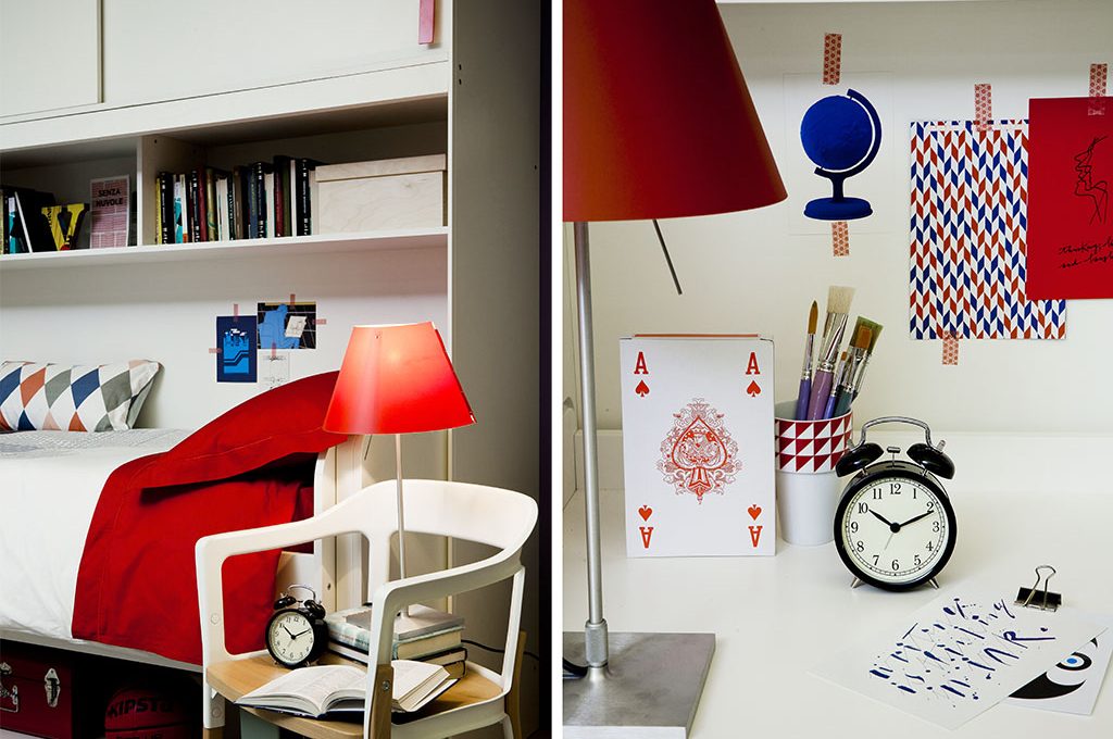 Sistema letto-armadio a ponte Web, in laccato bianco e dotato di ante scorrevoli con maniglie rosse [Spar cm 202x60/99/260h]. Calendario perpetuo Max 365 [Nava Design cm 32x32 €50]. Tappeto Etosha [Fazzini].