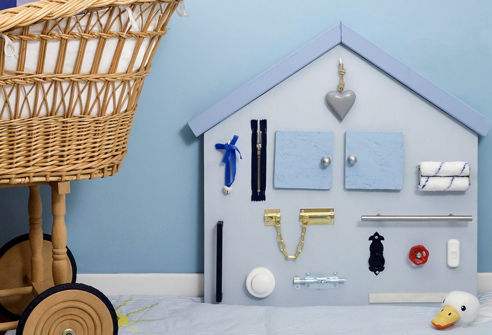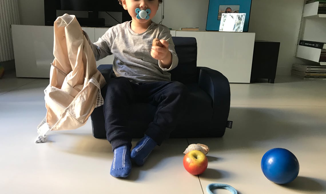 Selezioniamo sei oggetti che siano familiari al bimbo e che si differenzino per forma e tipo di superficie. Per il mio bimbo ho scelto una mela, un elastico per capelli, una noce, un cucchiaino, una conchiglia e una palla. Mettiamo gli oggetti in un sacchetto di stoffa. Per iniziare, estraiamo gli oggetti uno per volta, tocchiamoli, pronunciamone il nome e chiediamo al bimbo di fare altrettanto.