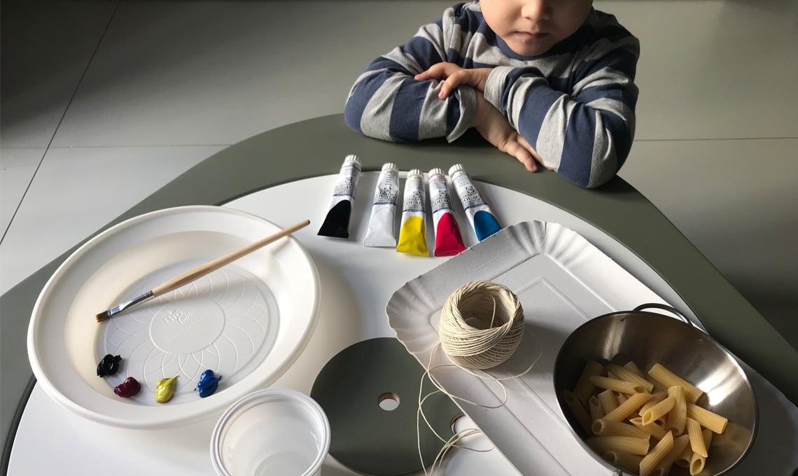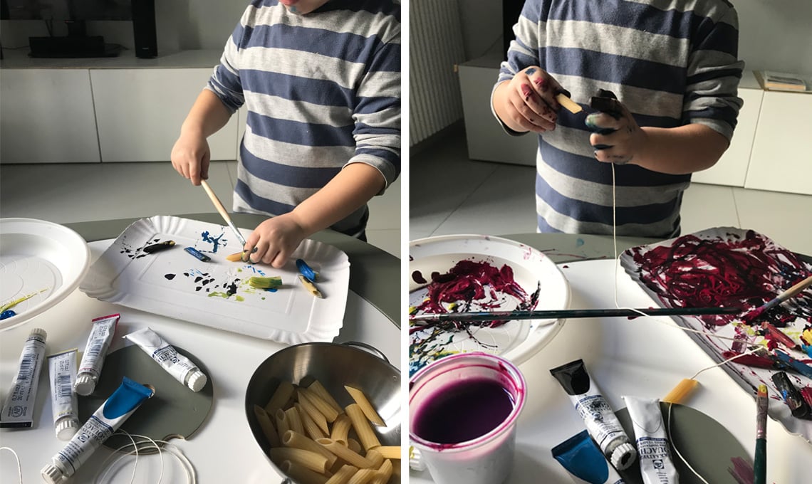 Questa attività prevede l'uso di perline: non avendone a disposizione, le ho sostituite con rigatoni e penne. Per aggiungere divertimento, ho pensato di far sperimentare al mio bimbo l'uso di pennelli e tempere con i quali ha colorato la pasta. Il gioco di infilare aiuta il bimbo a sviluppare la sua manualità e la ricerca di precisione. All'inizio sarà necessario mostrare al bambino come impugnare lo spago o la corda: facciamolo lentamente in modo che lui possa memorizzare i gesti più facilmente.