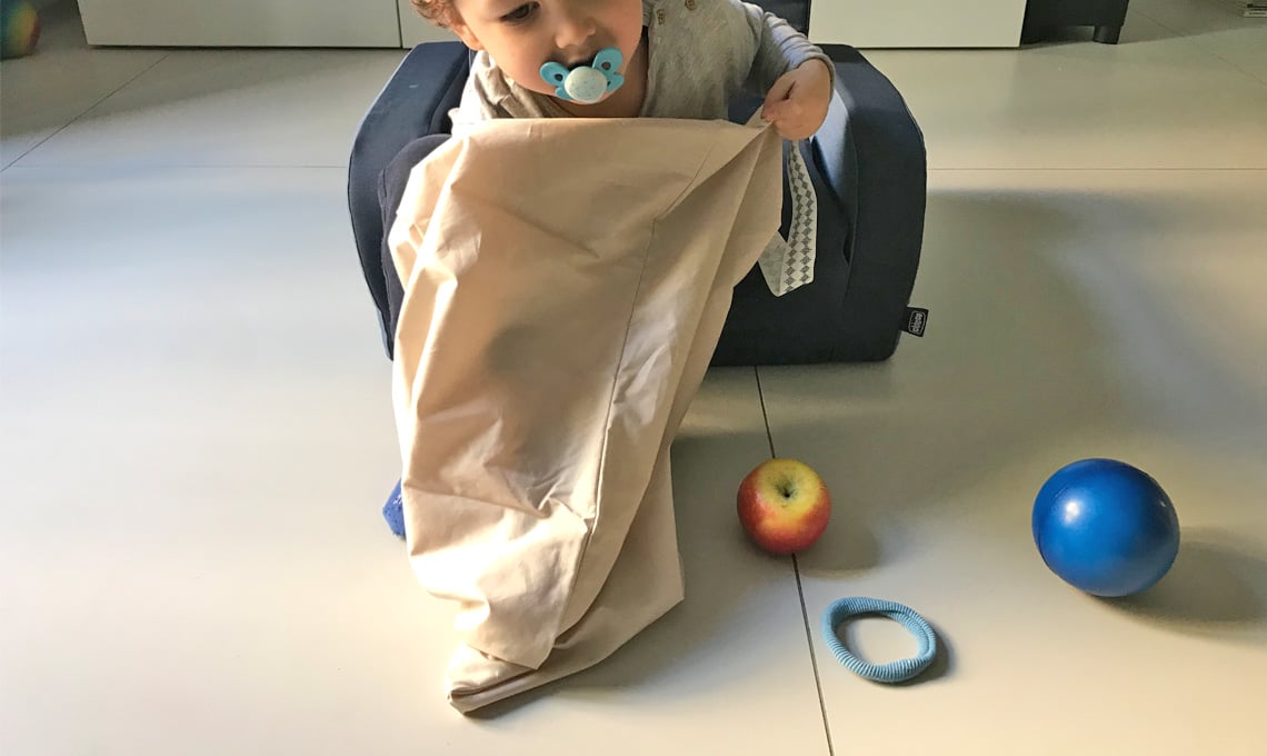 Dopo aver rimesso gli oggetti nel sacchetto, infiliamo nuovamente le mani, afferriamo un oggetto e prima di estrarlo, pronunciamone il nome. Poi sarà la volta del bambino. Questo gioco aiuta a sviluppare concentrazione, tatto e linguaggio.