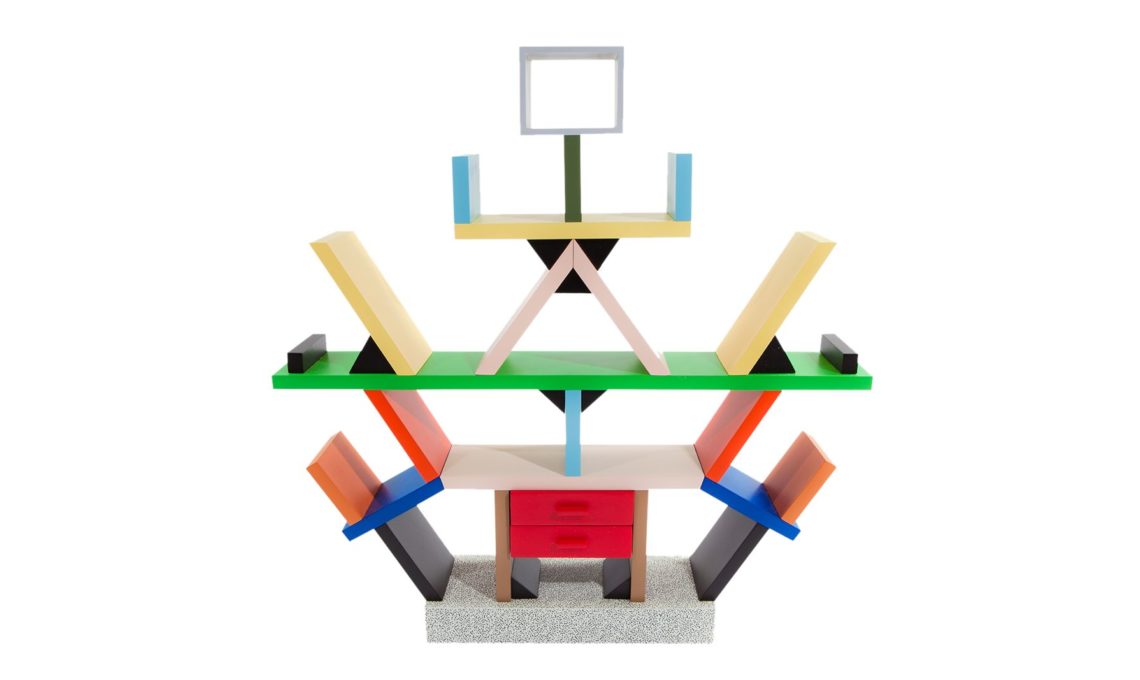 Uno sguardo radicale sul design, che mette a sistema nuove sperimentazioni sui materiali laminati (parte la storica collaborazione con Abet). Il manifesto di Memphis è questo: la libreria Carlton. Un mobile in forma umana con testa, braccia, piani in diagonale. Libreria ma da sempre anche ideale séparé.