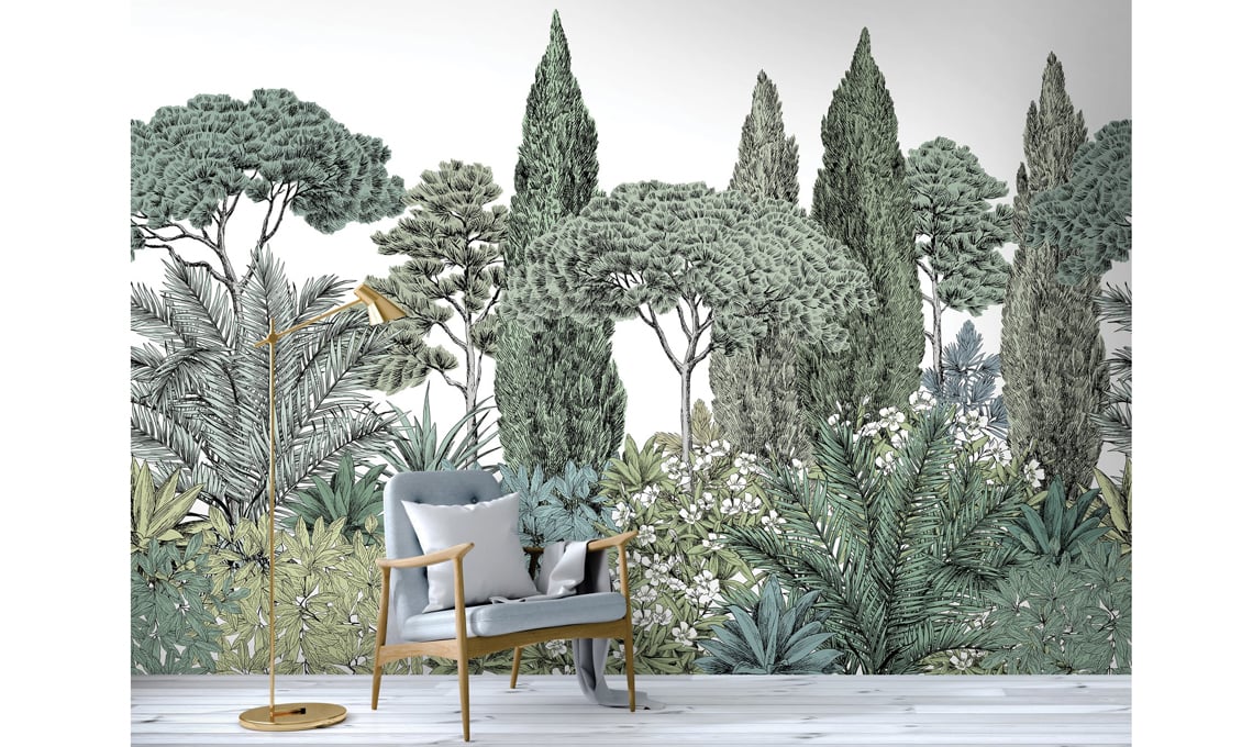 Con la decorazione murale Big Garden sembrerà di essere in una serra. L'immagine può essere stampata su carta da parati, tessuto adesivo e fibra di vetro [Creative Space].