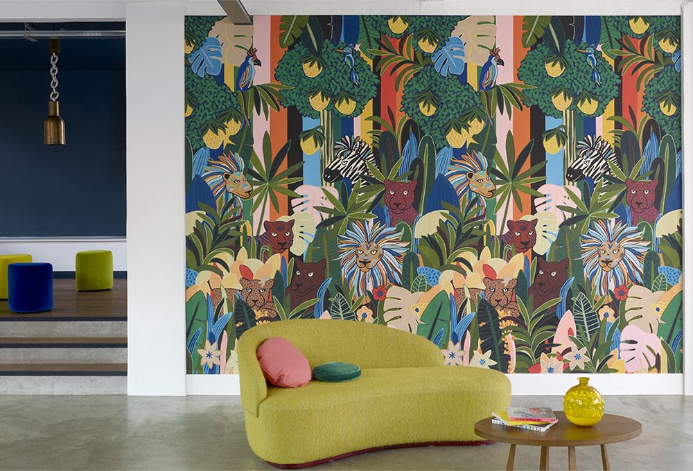 La carta da parati Sol dipinta dall'artista Jenne Pineau [Bien Fait, cm 70,8/141,7x110,2 €329 a rotolo].