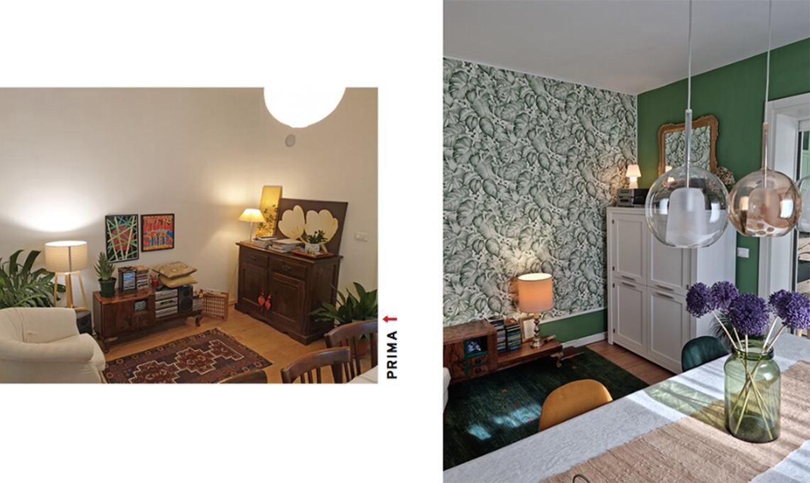 Per il salottino una carta da parati foliage, ho riverniciato il mobile e riutilizzato lampada e specchio lasciati in soffitta dai nonni». Non buttare! A volte basta una mano di colore per salvare una cucina: qui è stata scelta una tinta Natural Color System® [NCS S2020 G30]. Carta da parati n° 36627-2 della linea Natural Chic ordinata dal colorificio di fiducia [la trovi su edilizia prenestina.com].
