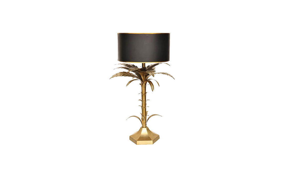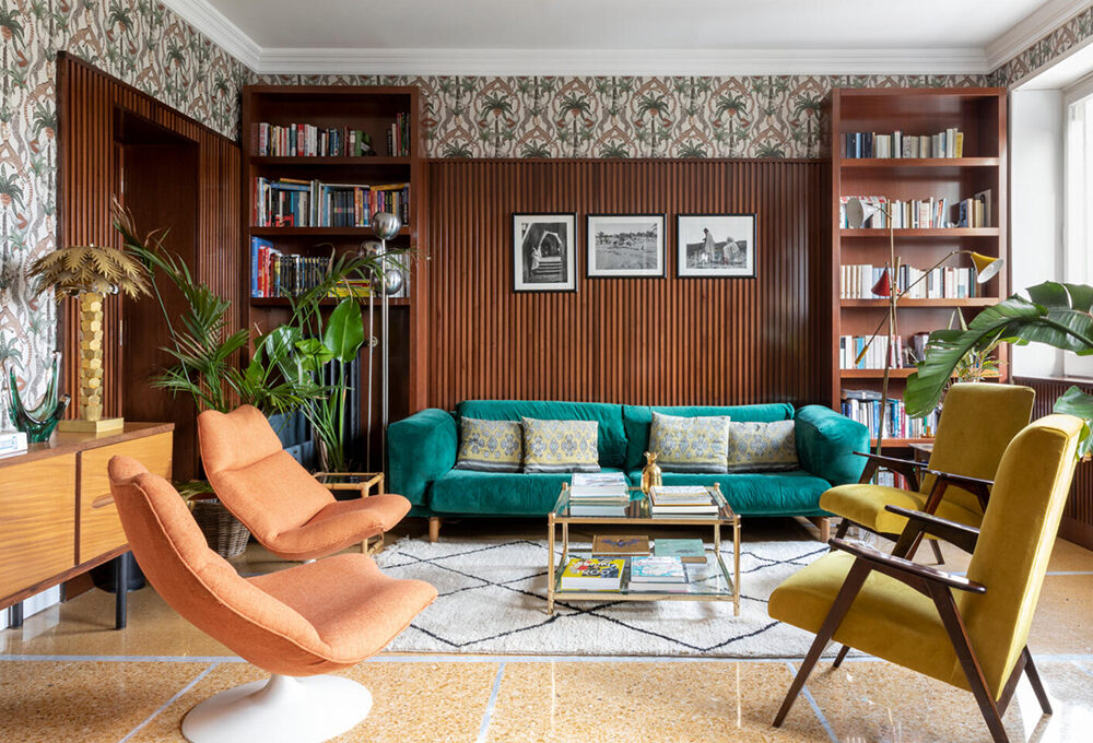 Il living è super chic se mixi le sedute Anni ’50, il tavolino Art Déco e la libreria minimal alle foto in bianco e nero e all’eccentrica lampada-palma.
