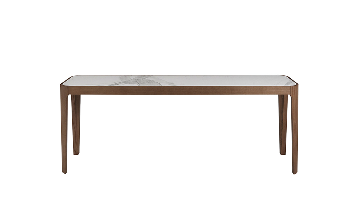 In varie misure e finiture della struttura e del top, il tavolo Cross [Riflessi, da cm 140x90x75h €1.769].