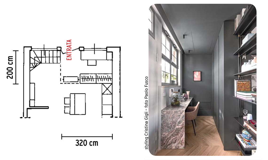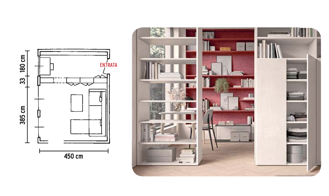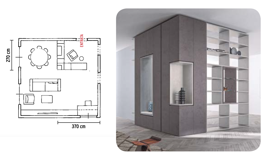 Quando il living è rettangolare e la porta è vicino a un angolo si può ricavare l’ingresso posizionando una libreria a doppio affaccio per tutta la larghezza del locale a circa 180 cm dalla parete, lasciando un vano aperto per il passaggio di almeno 80 cm. Se come qui hai una finestra puoi posizionarci davanti una scrivania e dar vita a uno studio.