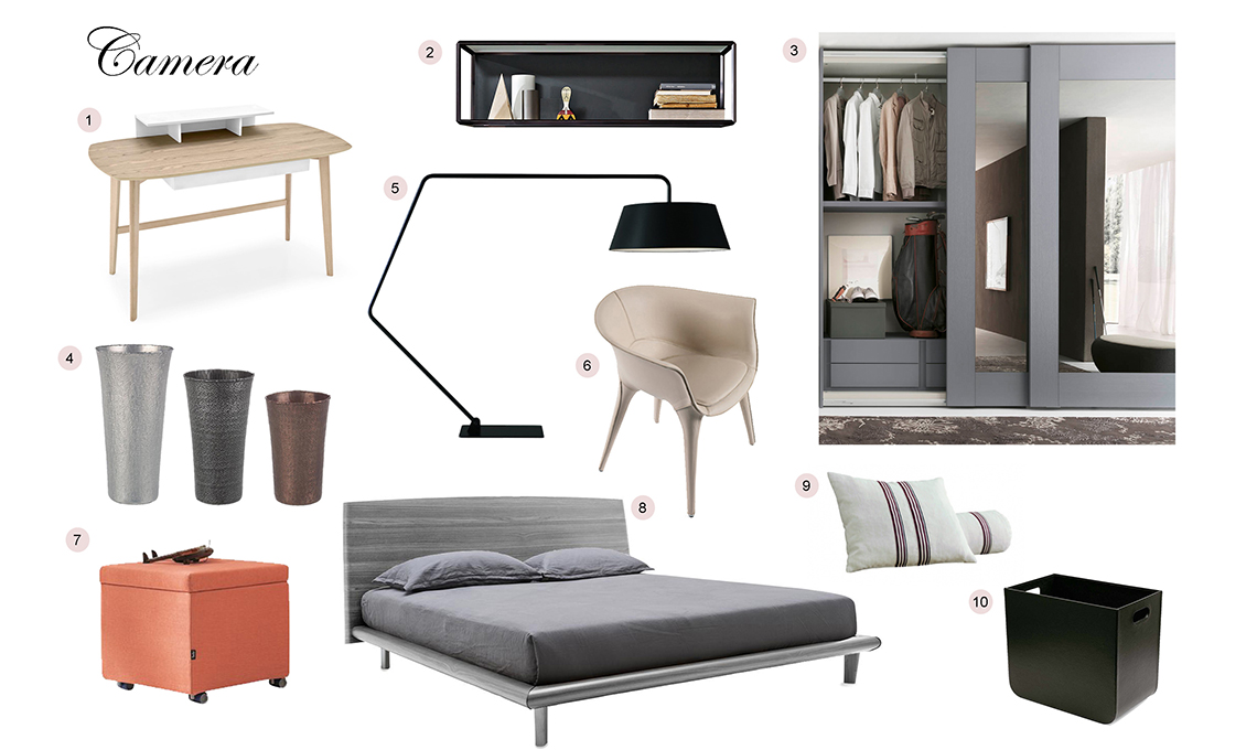 su linee leggere e stilizzate per tutti gli arredi. L’iconica lampada da terra di Ligne Roset dona eleganza con la sua essenzialità. 1. Scrivania in legno con alzatina Match [Calligaris, cm 130x65x75h €987]; 2. Pensile con struttura in cromo nero e schienale in laccato rovere grafite Grado Bookshelf [Molteni, cm 110x31x33h €701,50]; 3. Armadio in laccato rovere piombo Quadra [Alf DaFré, cm 95,2-110,6-44x226,239,255h a partire da €2.000]; 4. Set vasi in alluminio lavorato Graceful [Bizzotto, ø cm 14x24h, ø cm 15x28h, ø cm 16,5x34h €83]; 5. Lampada da terra Bul [Ligne Roset ø cm 65x185h €803]; 6. Poltroncina in pelle Doralee [Désirée, cm 68x57x72h €950]; 7. Pouf contenitore in tessuto corallo [Twils, cm 50x50x50h €296]; 8. Letto in struttura in legno impiallacciato grigio Dixie [Calligaris, cm 204,5x223x97h €1.459]; 9. Cuscini in tessuto con nastri ornamentali Stripe [Désirée, cm 35x35 €45]; 10. Portaoggetti in pvc nero Storage [Caligaris, cm 39,50x27,50x46h €69,50].