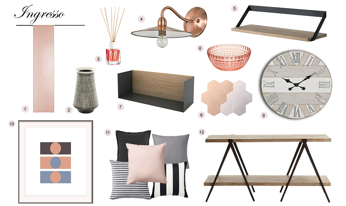 Alle nuances della graniglia abbina arredi in legno, rame, color corallo e poi aggiungi qualche tocco di nero, effetto eye-liner! 1. Tenda a pannello in tessuto [Rollmayer, cm 201/250 €14,95]; 2. Vaso in ceramica Just [Rikki Tikki, ø cm 9x20h €20]; 3. Diffusore di essenza [Tescoma, 100 ml €12,90]; 4. Lampada a parete in rame Cantina AP1 [Ideal lux, cm 25x29x15h €71,98]; 5. Mensola a parete in legno e metallo Ribbon [Universo Positivo, cm 70x20x17h €101]; 6. Contenitore Tiffany [Guzzini, ø cm 25x11h €13,50]; 7. Mensola a parete in legno e metallo U [Universo Positivo, cm 55x20x20h €101]; 8. Specchio componibile Hönefoss [Ikea, cm 18x21h €14,50]; 9. Orologio a parete Dane [Bizzotto, cm ø 63,5x5 €73,80]; 10. File stampabile Opera d’arte minimalista Nordic [Suites and Candy su Etsy.com €4,27]; 11. Fodere cuscini Bianco e nero Vargyllen [Ikea, cm 50x50 €5,99], Rosa pallido Gurli [Ikea, cm 50x50 €3,99], Grigio Ursula [Ikea, cm 65x65 €12,99], Grigio e bianco Stockholm 2017 [Ikea, cm 50x50 €12,99], copricuscino nero Mat [Bassetti, cm 60x60 €12,60]; 12. Consolle con struttura in metallo color antracite e ripiani in legno naturale Morgan [Mondo Arredamento, cm 154x51x76h €452,21].