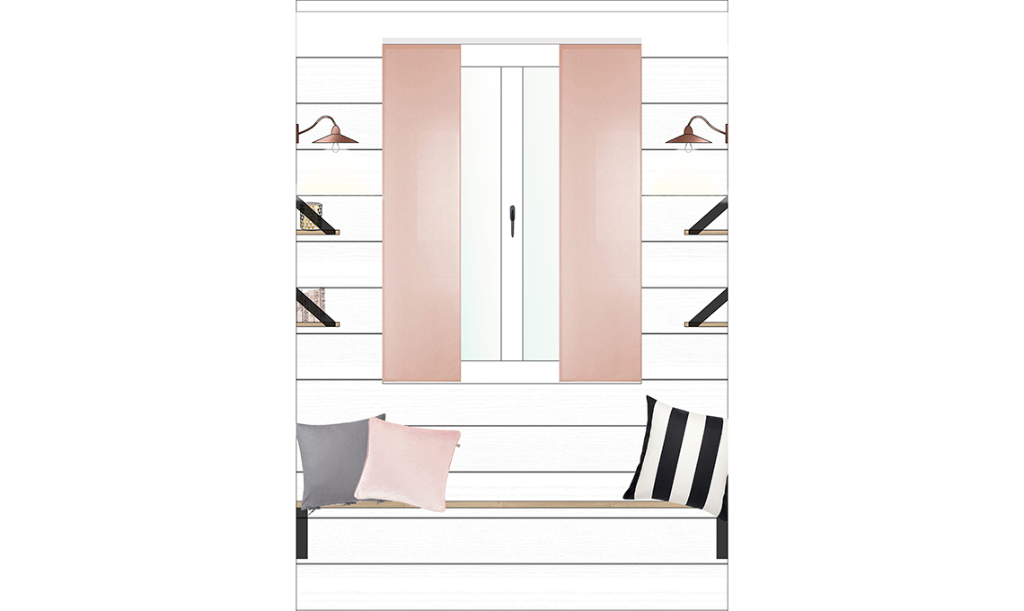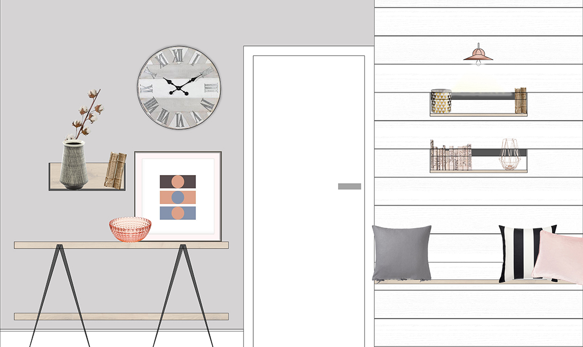 Rivestendo una parte dell’ingresso con perlinato mdf spazzolato bianco a doghe orizzontali e fissando a parete un’asse di legno che funge da seduta sui tre lati, puoi creare una zona relax illuminata dalla finestra. Alterna i cuscini in rosa cipria, nero e grigio a tinta unita con altri dalle fodere a righe e con disegni optical black&white.