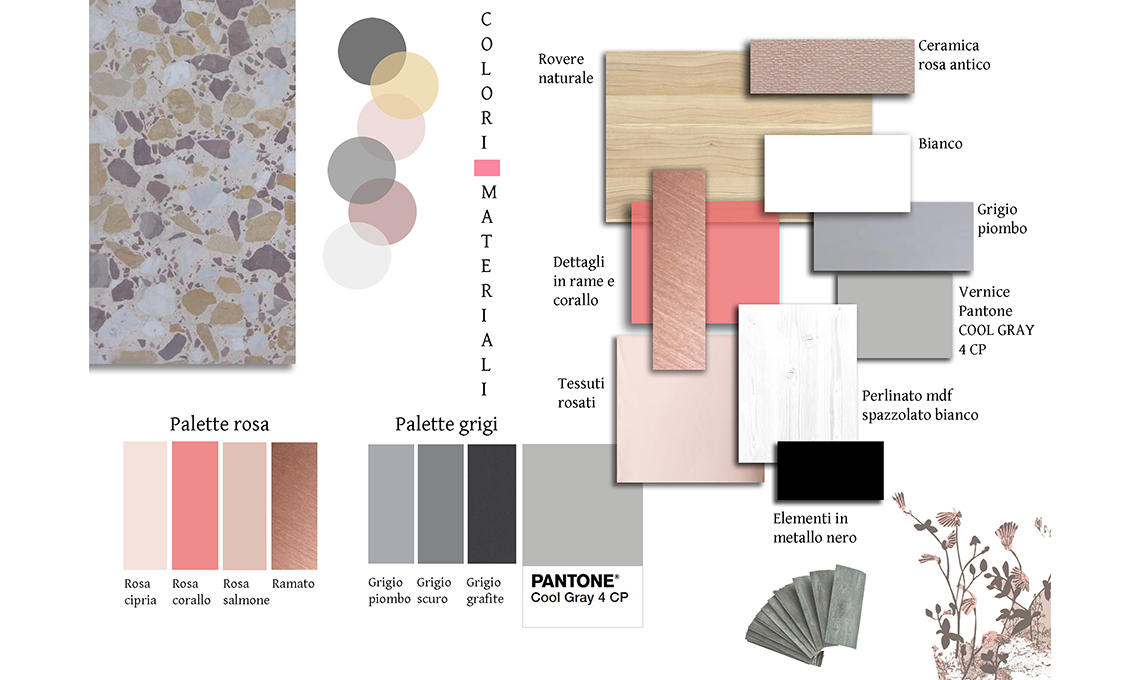 Cara Lina, per esaltare la tua pavimentazione in graniglia tipica degli Anni ’50 variegata e colorata devi ‘seguire’ le sue nuances. Utilizzando il legno e diverse gradazioni di grigio per gli arredi otterrai un effetto nordico reso originale da sfumature di rosa che evocano l’atmosfera Anni ’50: volta pagina per scoprire l’ingresso trasformato! In generale ti consiglio di utilizzare geometrie lineari, tonalità delicate e materiali semplici. Evita invece mobili vintage dai colori scuri, cromie forti, texture ricche ed elaborate. Nelle pagine seguenti ti suggerisco una serie di arredi da abbinare al tuo pavimento, dall’ingresso alla camera. In tutta la casa il colore giusto per le pareti è il Pantone Cool Gray 4 CP di Max Meyer che crea uno sfondo omogeneo in contrasto con il battiscopa in mdf alto e bianco (vernicia di bianco anche gli infissi!). Se invece deciderai di coprirlo, ti consiglio il Microtopping di Ideal work o pavimenti resilienti LVT con polimeri a base vinilica Sintesy di Skema.