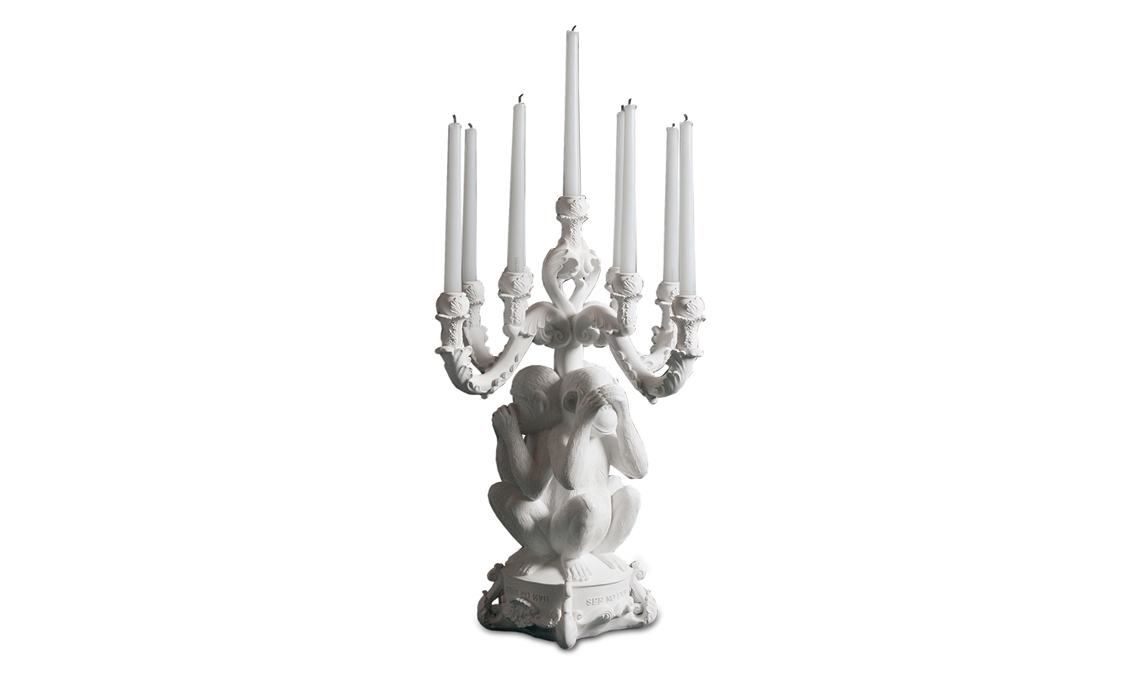 Cita con ironia lo stile barocco, il candelabro Burlesque con le tre scimmiette 'non vedo, non sento, non parlo' [Seletti, cm 60h €385].
