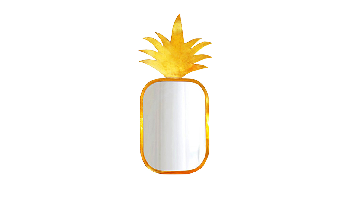 Realizzato in latta sagomata con finitura ottone lucido, Ananas ha un laccio in cuoio per appenderlo.