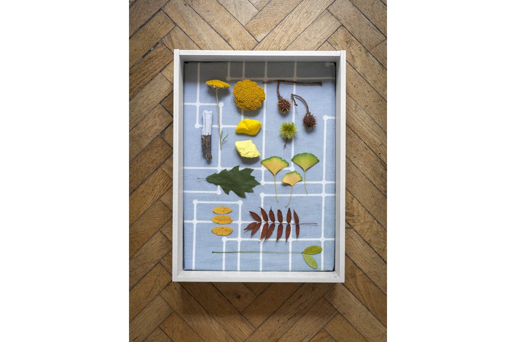 Un gioco di contrasti fra decori geometrici e forme naturali, toni neutri e palette che sfumano dal rosso al verde al giallo, caratterizzano la teca per esporre le foglie raccolte durante le gite fuori porta. Il tessuto in 100% cotone grigio con linee bianche Connect Fjord [Kirkby Design, cm 136h €41,50/m], infatti, crea una sorta di griglia che ti aiuta a dare vita alla tua composizione di foglie da applicare con la colla.