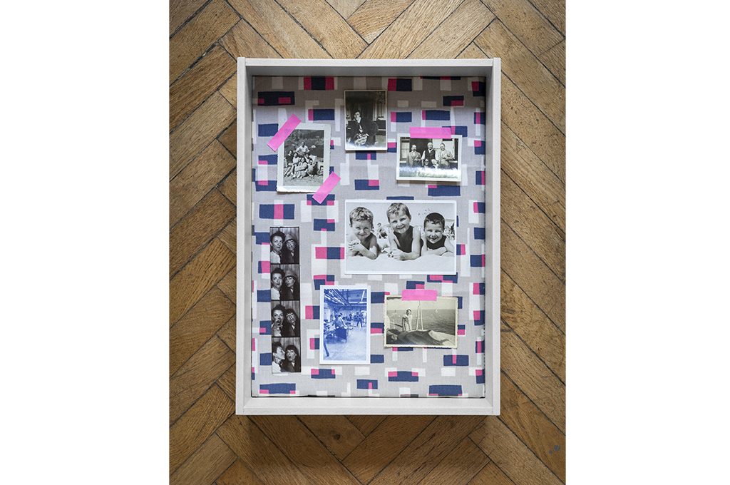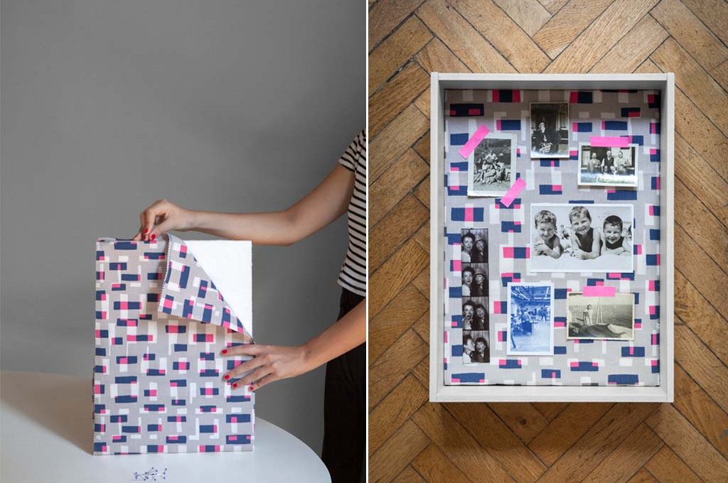 Tutti, da ragazzi, abbiamo tappezzato le pareti della nostra camera di foto fissate con le puntine da disegno direttamente sul muro... Beh, riprendi quella vecchia abitudine ma rendila decoro e, perché no, ‘arte’. Fissa al fondo della scatola un tessuto con tratti fluo come Ida Fuchsia [Villa Nova, cm 136h €42,50/m], quindi scegli vecchie foto in bianco&nero di famiglia, o fatte con gli amici, e fissale con un washi tape in nuance [Scrap It Easy €2,50 il rotolo da m 10].