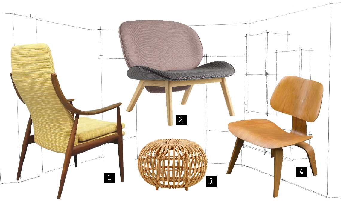 1. Poltrona danese vintage in teak anni 50 designer Peter Hvidt, model FD152 [Lack00danishlab, €1600], 2. poltrona Poltrona L32 Suru, grigio scuro e rosa [FDB Møbler, €1500], 3. Pouf Franco Albini, piccolo [Sika-Design, €379], 4. Sedia LCW vintage in quercia di Charles & Ray Eames per Herman Miller, anni '50 [Pamono, €3000],