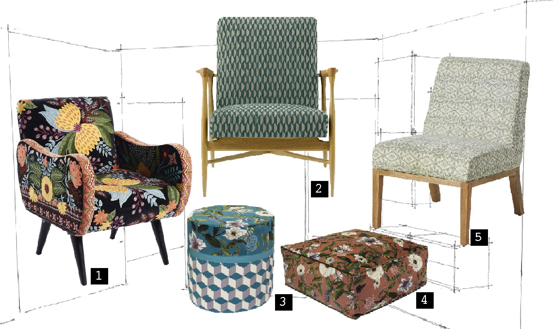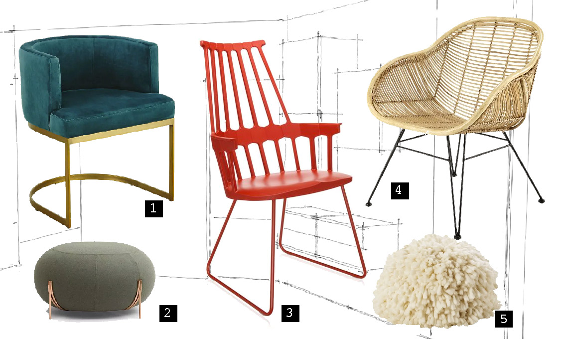 1. .poltroncina in velluto e metallo Requiem [Maisons du Monde, €249 ], 2. pouf Geo [Saba, prezzo su richiesta], 3. poltrona in acciaio verniciato con epoxi-poliestere Comback [Kartell, €391], 4. Poltrona in rattan e in metallo nero Pitaya [Maisons du Monde, €199], 5. Pouf a pelo spesso écru Amenos [Maisons du Monde, €119].
