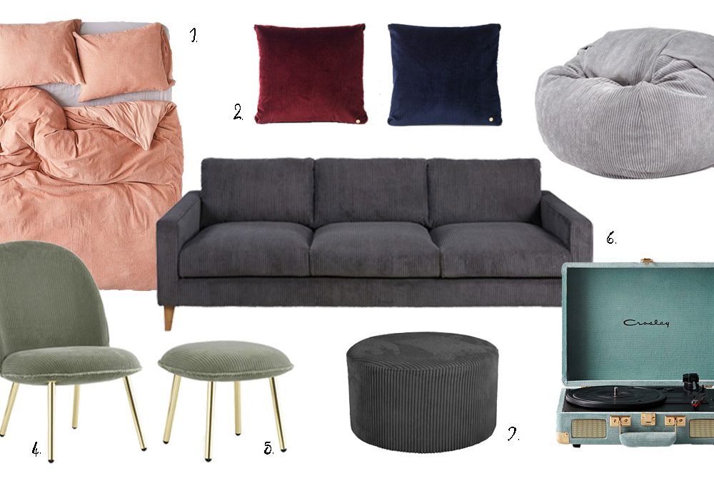 1. Divano Kant [Maisons du Monde, 235x95xh86 cm, € 999], 2. Cuscino a maglia [Ferm Living, 60x40 cm, € 69], 3. Pouf Tamburello [Novamobili, ø 45 cm a partire da € 318, ø 60 cm a partire dal € 370], 4. Tappeto Stamen [Habitat, 240x170cm, € 259], 5. Coffee table Cage [Menu, 43x43xh30 cm, €200], 6. Vaso della collezione Grammichele monochrome [Waiting for the bus, prezzo su richiesta].