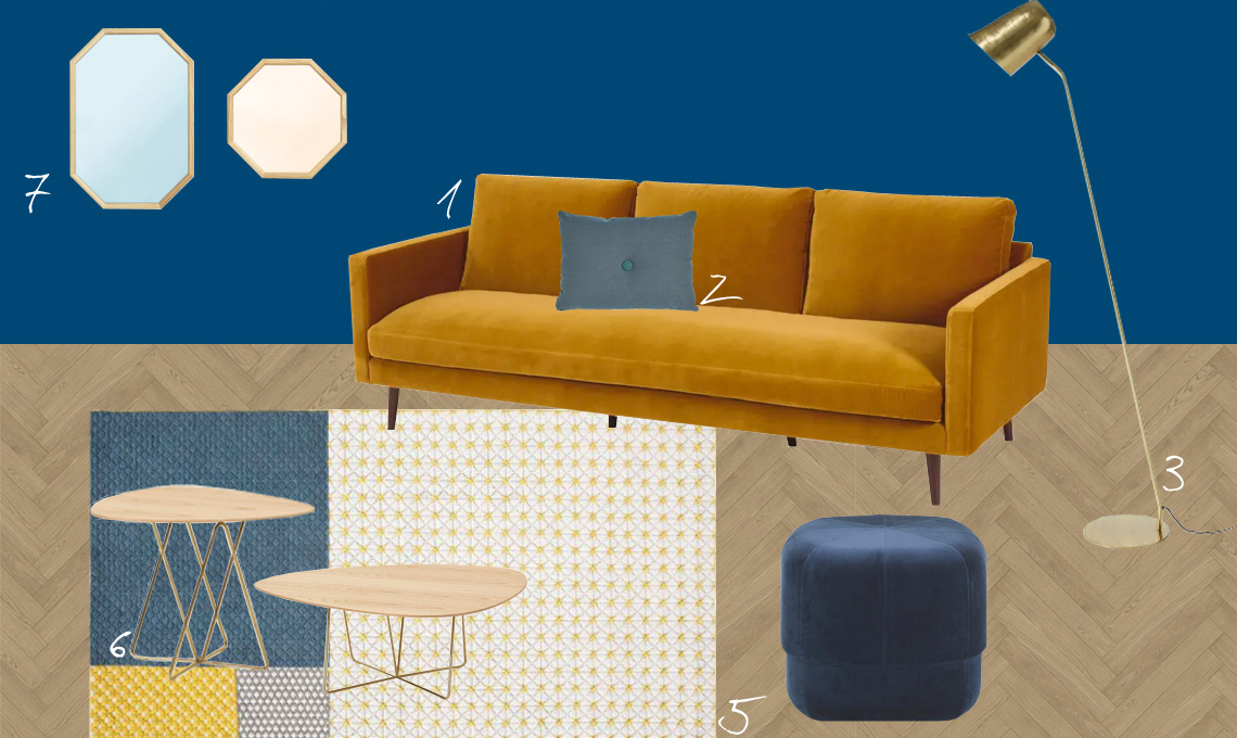 1. Divano Kant [Maisons du Monde, 235x95xh86 cm, € 999], 2. Cuscino Dot [Hay, 60x45 cm, € 79], 3. Lampada da terra Margaret [Maisons du Monde, metallo dorato, h 140, €119], 4. Pouf Circus [Norman Copenhagen, 40x46xø46 cm, velluto, €455], 5. Tappeto Silai [GAN, 100% lana, 200x300 cm, €2745], 6. Coffee table Dabliu [Désirée, struttura in oro lucido, piano in mdf impiallacciato in castagno naturale, disponibile in tre dimensioni: 59x55 cm, € 450, 97x92 cm, € 752, 127x120 cm, € 1061], 7. Specchi Lust Mirror Large Blue e Lust Mirror Medium Gold [Norman Copenhagen, cornice in quercia, 80x55 cm e 50x50 cm, €120 e €135].