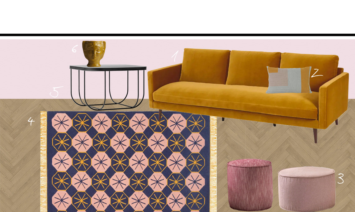 Nella seconda ambientazione il giallo senape del divano duetta con gradazioni di rosa e con accenti di nero e di viola. Il divano Kant di Maisons du Monde è abbinato al cuscino a maglia di Ferm Living, al pouf Tamburello di Novamobili, al tappeto Stamen di Habitat, al coffee table Cage di Menu e al vaso della collezione Grammichele monochrome di Waiting for the bus. Se ti piace l'idea di una parete di questa tonalità di rosa, il codice colore è NCS S 0510-R30B che puoi ricreare con il colore 048R #E5BDC2 di San Marco.