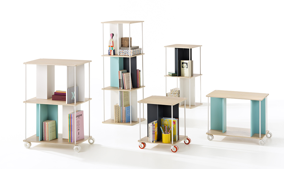 Autoportante e bifacciale Domino, ha ripiani in multistrato di rovere sostenuti da sottili tondini in metallo. Può avere base quadrata da 41x41 cm o rettangolare da 41x61,5 cm e è disponibile in più colori.