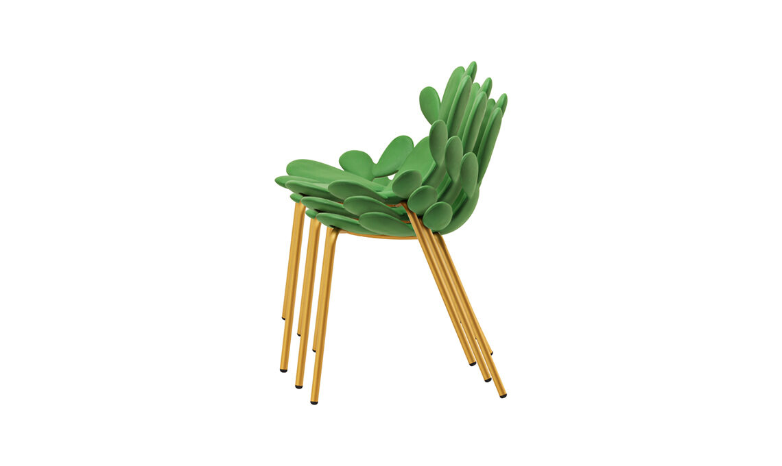 Leggera anche nelle forme Lilia, ‘aperta’ sullo schienale [Riflessi, cm 48x47x80h da € 219].