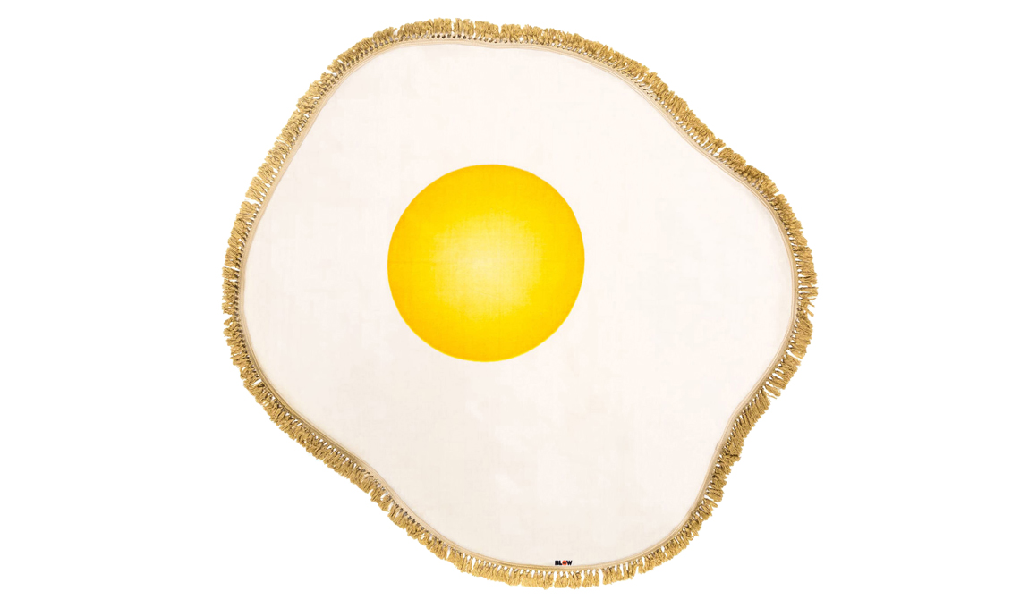 Un uovo al tegamino con frange dorate: è l’originale modello Oeuf di Seletti, in cotone e poliestere [su Made in Design, ø cm 200 € 690].