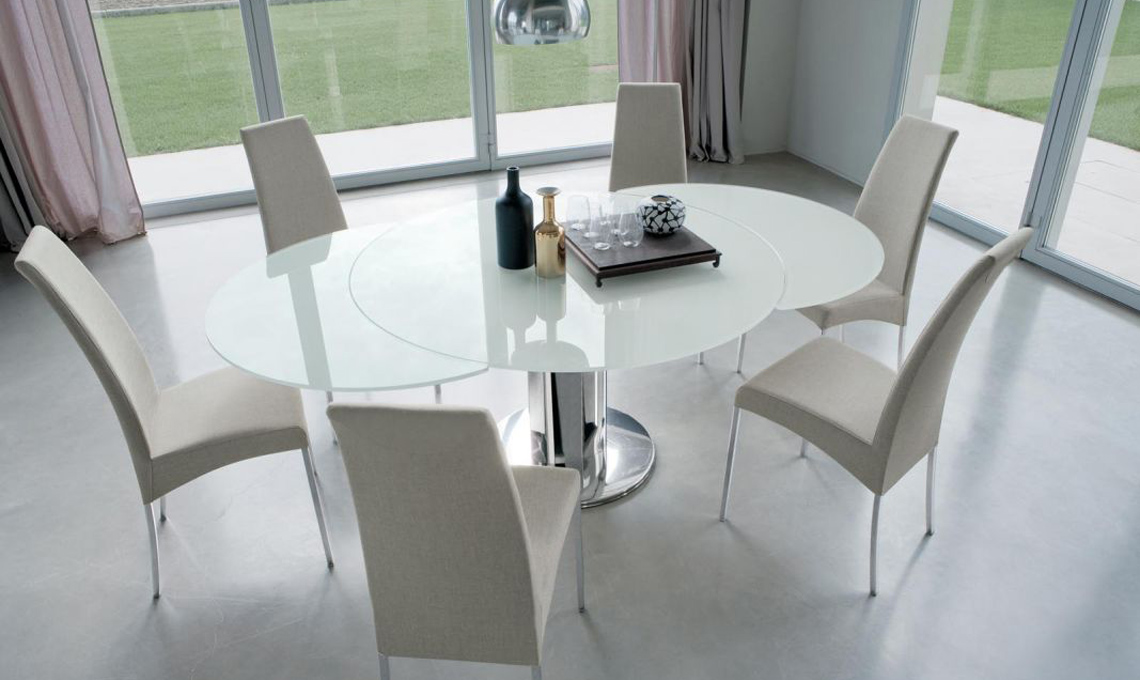 Tavolo rotondo allungabile Giro con meccanismo di apertura telescopico sincronizzato, struttura in acciaio laccato o inox. Piano in cristallo antigraffio. Disponibile in diverse finiture e basamenti diversi [Bontempi, cm 130/210x75, prezzo da rivenditore].