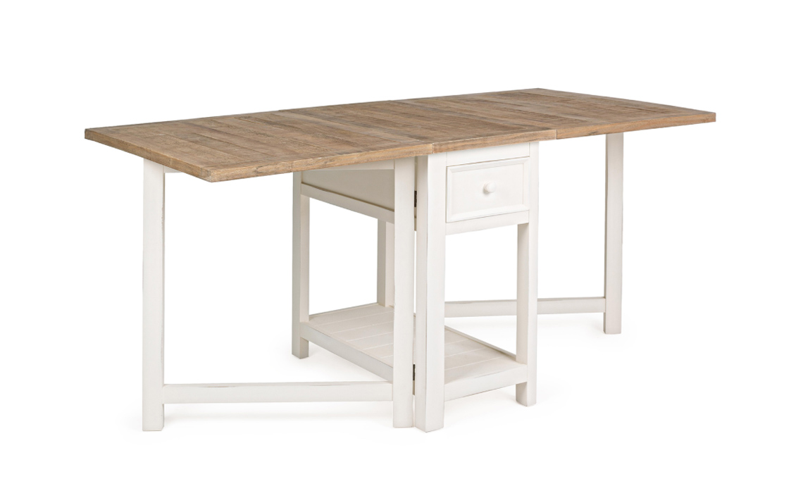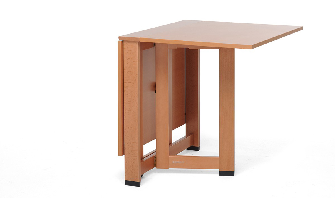 Tavolo con ribalte Cartesio in legno massiccio, una volta chiuso può contenere fino a quattro sedie modello Luna [Foppapedretti, cm 75x12,5/69/126xh74, €402,50].