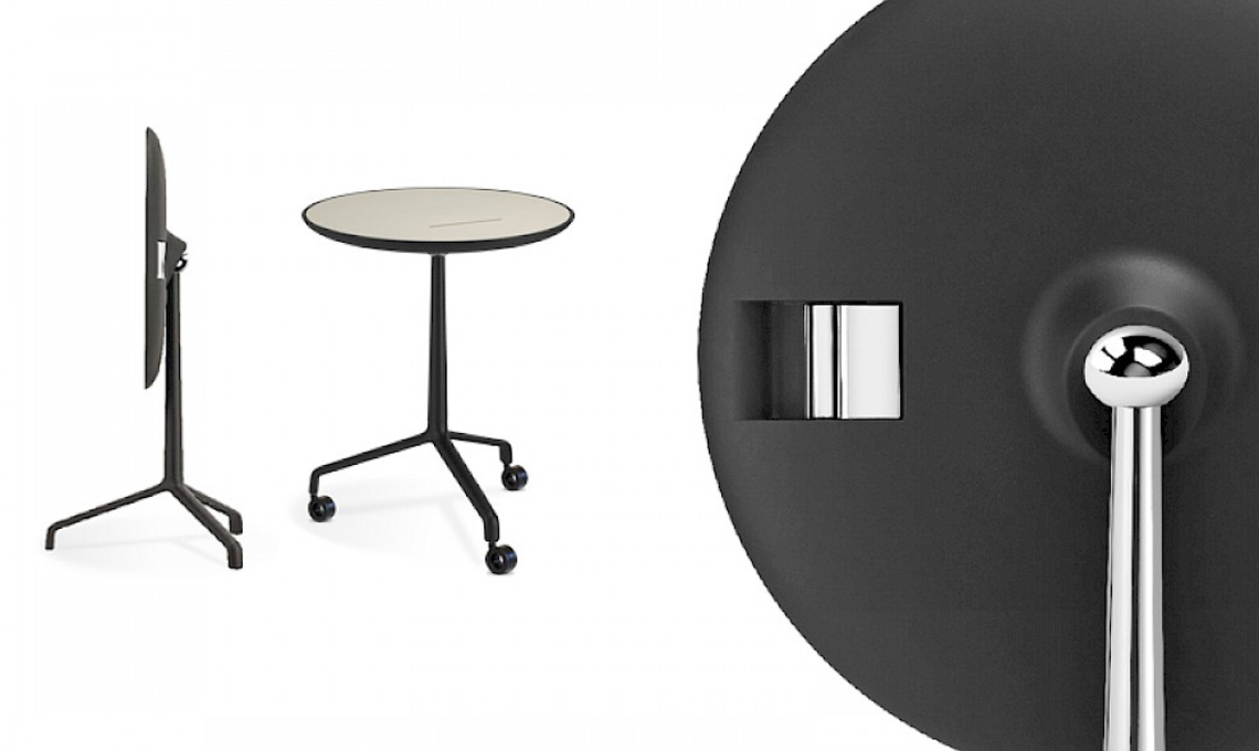 Tavolino UseMe con piano inclinabile fino a 30° utilizzabile da seduti o in piedi come piano di lavoro. Disponibile con ruote e piano rotondo o rettangolare in laminato HPL, laminato Fenix NTM®, legno di betulla multistrato o MDF laccato [Sitland, cm h74xø60, prezzo da rivenditore].