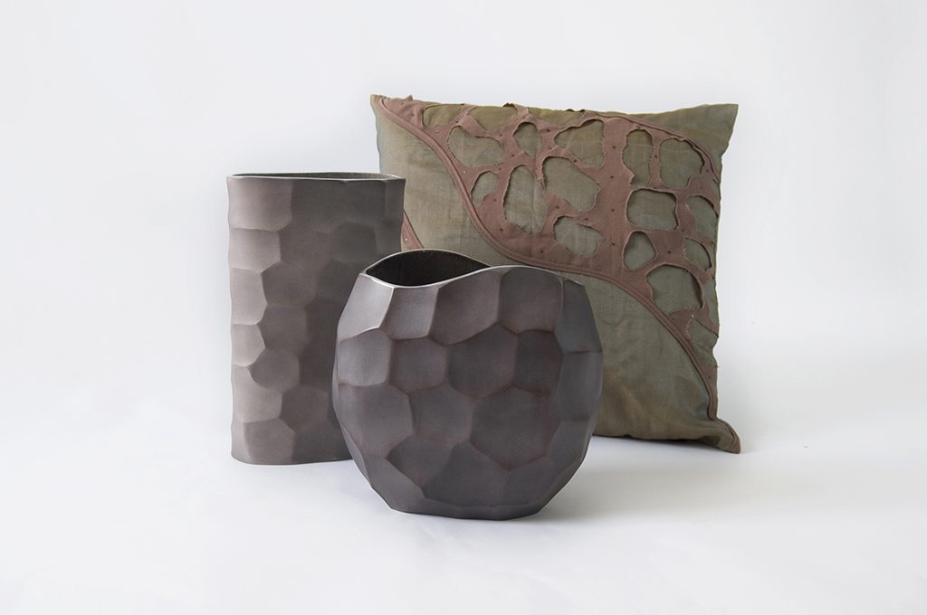 Artigianali: vasi in alluminio lavorato per ‘mimare’ la pietra; cuscino in seta e cotone [DID prezzi su richiesta].