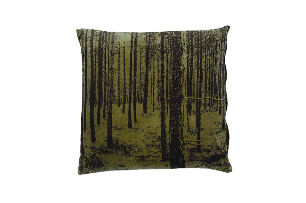 Stampato e lavorato a mano il cuscino in cotone organico [Nicolette Brunklaus, cm 60x60 €98].