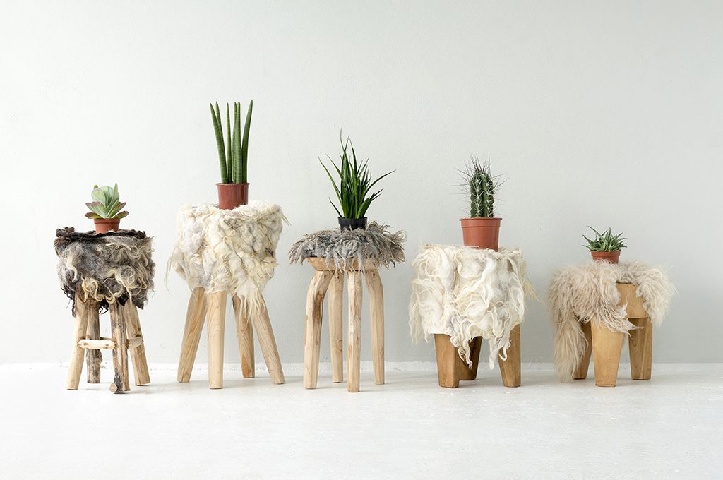 Ecologici, rivestiti di feltro lavorato con un’antica tecnica, gli sgabelli in legno di Beatrice Waanders [The Soft World da €300].