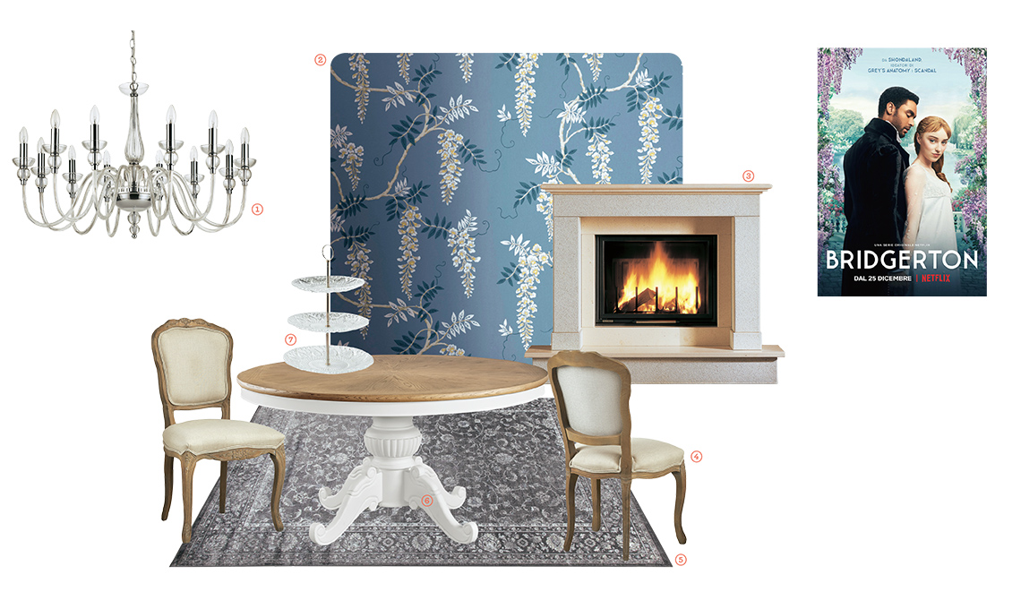 Cristalli scintillanti, wallpaper floreali, tappeti persiani e materiali importanti come marmi e legni torniti... More is chic! La sala da pranzo Regency è ispirata a Bridgerton. La serie è basata sui romanzi di Julia Quinn ambientati nella Londra georgiana. Tra balli, palazzi sontuosi e gossip, le giovani donne dell’alta società cercano marito spinte dalle madri che sognano per loro la migliore sistemazione. Prodotta da ShondaLand [su Netflix].