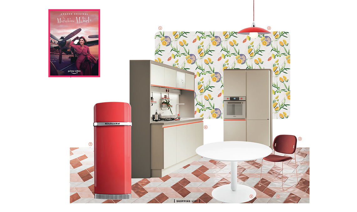 Linee bombate e materiali belli e pratici come i laccati (allora nuovi e oggi di gran moda), pattern geometrici e decori di ispirazione naturale. I colori? Decisi e di carattere ispirati alla fantastica Signora Maisel. Midge Maisel è una giovane casalinga ebrea newyorkese dell’upper class Anni ‘50 che, all’improvviso, si scopre comica e stravolge la vita della famiglia per inseguire il suo sogno di ‘stand-up comedian’ [su Amazon Prime Video].