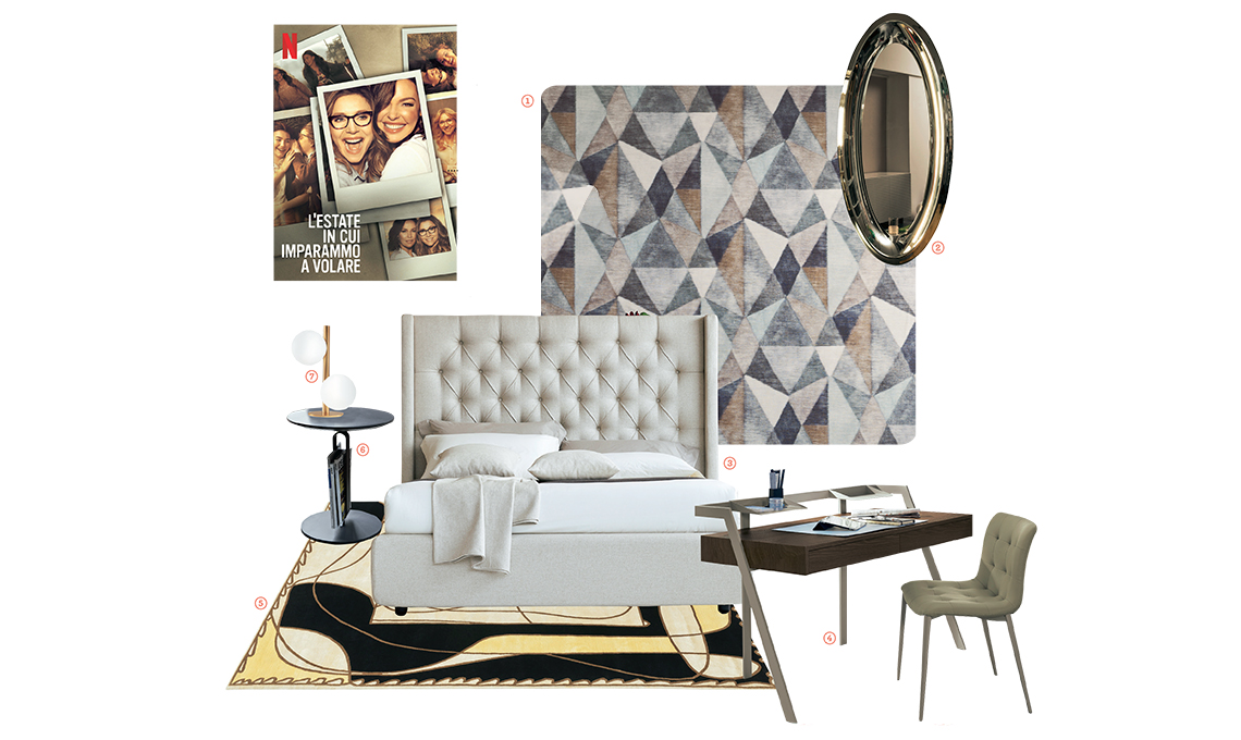 € 1.561,60]; 3. letto Star con maxi testata capitonné, qui rivestito in misto lino Tobago corda [Noctis, cm 192x221x160h prezzo da definire]; 4. scrittoio Zac in acciaio laccato sabbia e legno impiallacciato rovere con sedia Kuga in ecopelle [Bontempi, cm 133x67x88h € 1.330 e € 350]; 5. tappeto Le Ragazze in seta, lana e cotone dal decoro stilizzato [Karpeta, da cm 170x240 € 5.795]; 6. tavolino Alfred in acciaio laccato antracite e top in legno laccato antracite opaco [Bontempi Casa, ø cm 45x49h € 315]; 7. lampada Twist in tubolare di metallo verniciato satinato e bulbi in vetro bianco satinato [Riflessi, ø cm 15x40h € 317,20].