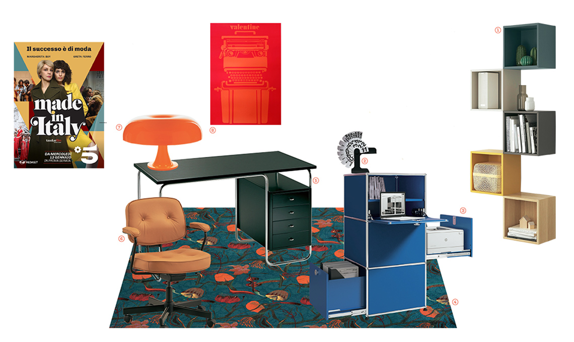 1. pensili Eket in vari colori, da combinare a piacere [Ikea, cm 70x25x175h € 100]; 2. calendario perpetuo Timor [Danese, cm 17x9x16h € 124]; 3. mobile con cassetti e ante a ribalta in metallo [Usm, cm 75x35x105h da € 1.922]; 4. moquette Nebula, design Cristina Celestino [Besana € 243/mq]; 5. scrivania Comacina con cassettiera, struttura in tubo di acciaio inox. Piano e cassettiera verniciati goffrati antigraffio in bianco o nero [Zanotta, cm 130x65x75h € 3.024]; 6. sedia Alefjäll in pelle con rotelle; sedile e schienale regolabili in altezza [Ikea, cm 51x64x95h € 249]; 7. lampada Nesso in resina ABS arancione [Artemide su lovethesign.com, ø cm 54 € 255]; 8. poster pubblicitario del 1969 della macchina per scrivere Valentine [Archivio Storico Olivetti, cm 68,5x48,3 € 20].