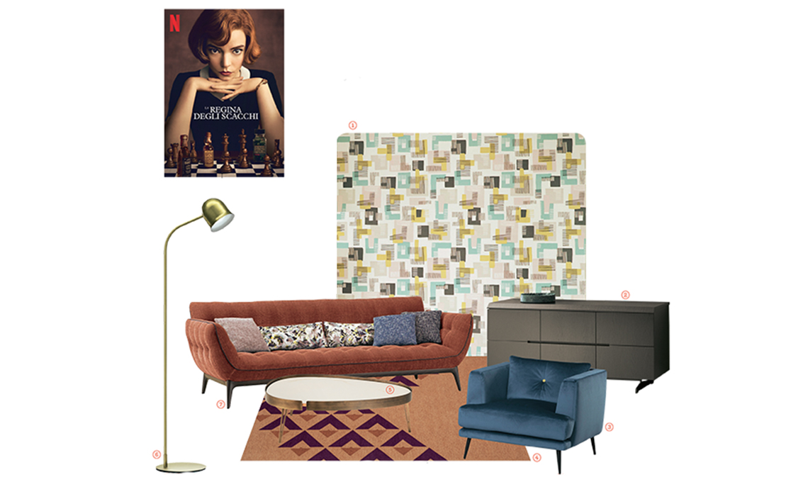 Forme avvolgenti, impunture e tessuti morbidi in tinta unita si abbinano a decori geometrici. Il salotto Sixties è ispirato alla serie 'La regina degli scacchi' che narra la storia di Beth Harmon dagli 8 anni, quando comincia a giocare a scacchi in orfanotrofio, fino ai 22, quando arriva al campionato mondiale... riuscirà a vincerlo? [Su Netflix].