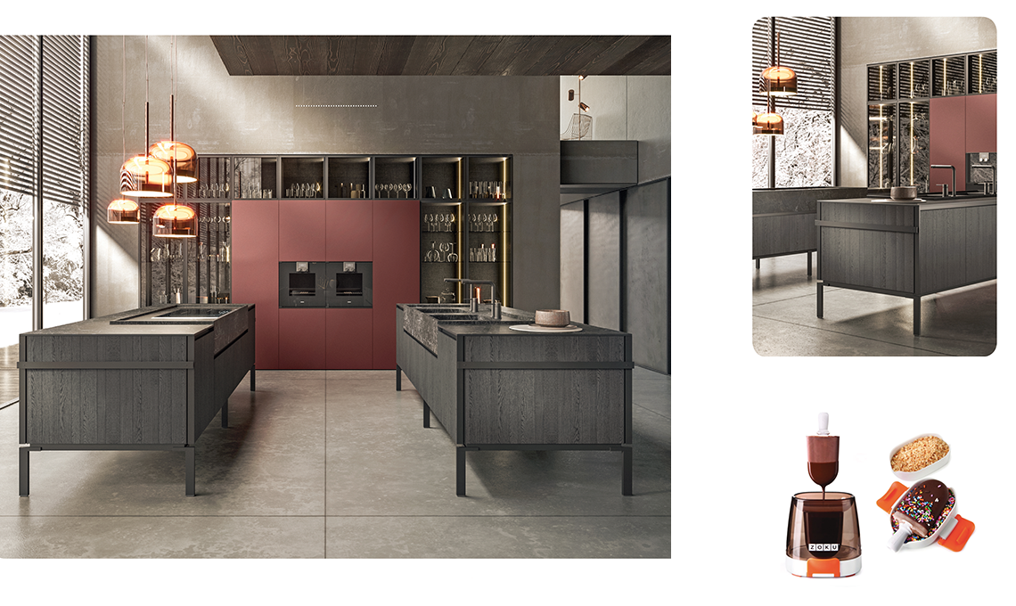 Le diverse funzioni si identificano con materiali diversi: gli elettrodomestici sono dietro ante laccate, il contenimento è a vista nelle vetrine, le due zone lavoro - isole sono in legno e grès. E la disposizione a C crea il perfetto triangolo ergonomico. Le isole poggiano su un basamento dalla struttura in alluminio nero opaco, sostenuto da piedini. La parete a colonne ha al centro i moduli con gli elettrodomestici contornati da elementi a vetrina. Il blocco centrale delle isole è realizzato in grès Nero greco con profilo Drop con fuochi e lavelli.