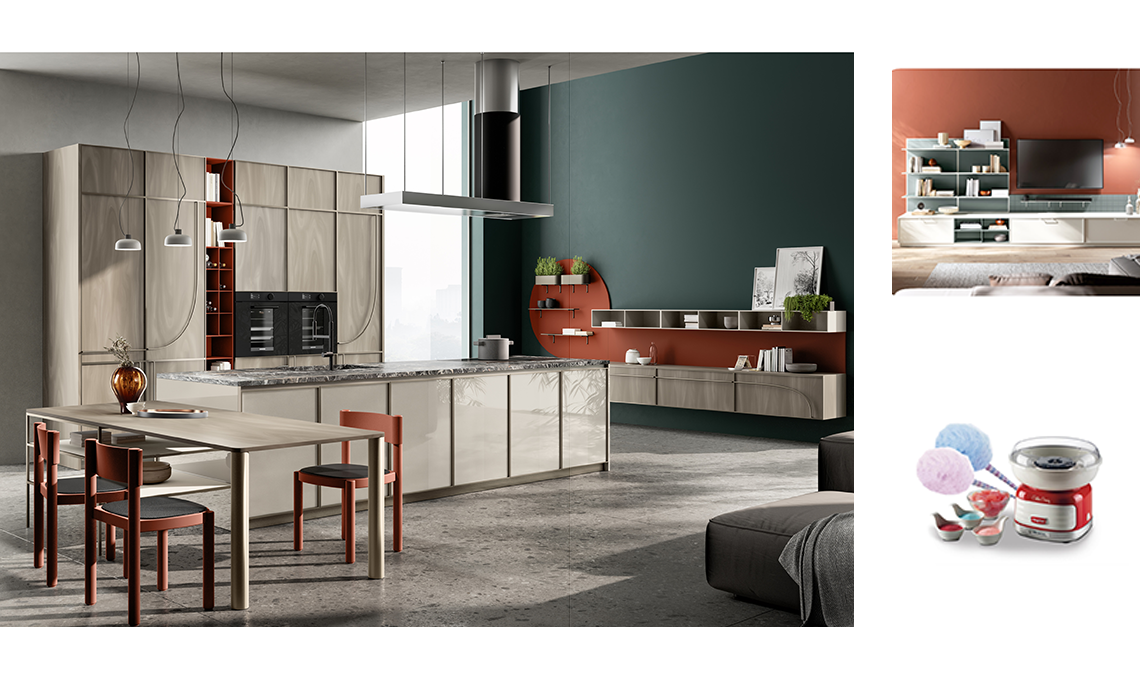 Grazie a un sistema di elementi, colori e finiture che dialogano tra loro, puoi dare a cucina, pranzo e soggiorno un total look coordinato.