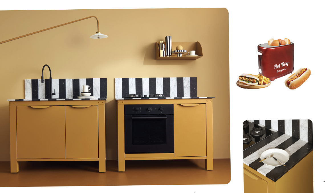 I moduli di questa cucina si possono montare e smontare facilmente nonché modificare nel tempo, in modo da poterla installare in ogni tipo di ambiente e spazio: ti segue a ogni eventuale trasloco o cambio di stile. È disegnata dalla designer svedese Tekla Evelina Severin che ha combinato la bellezza del piano in marmo a bande bianche e nere tipico dell’architettura italiana romanica al caratteristico giallo nordico.