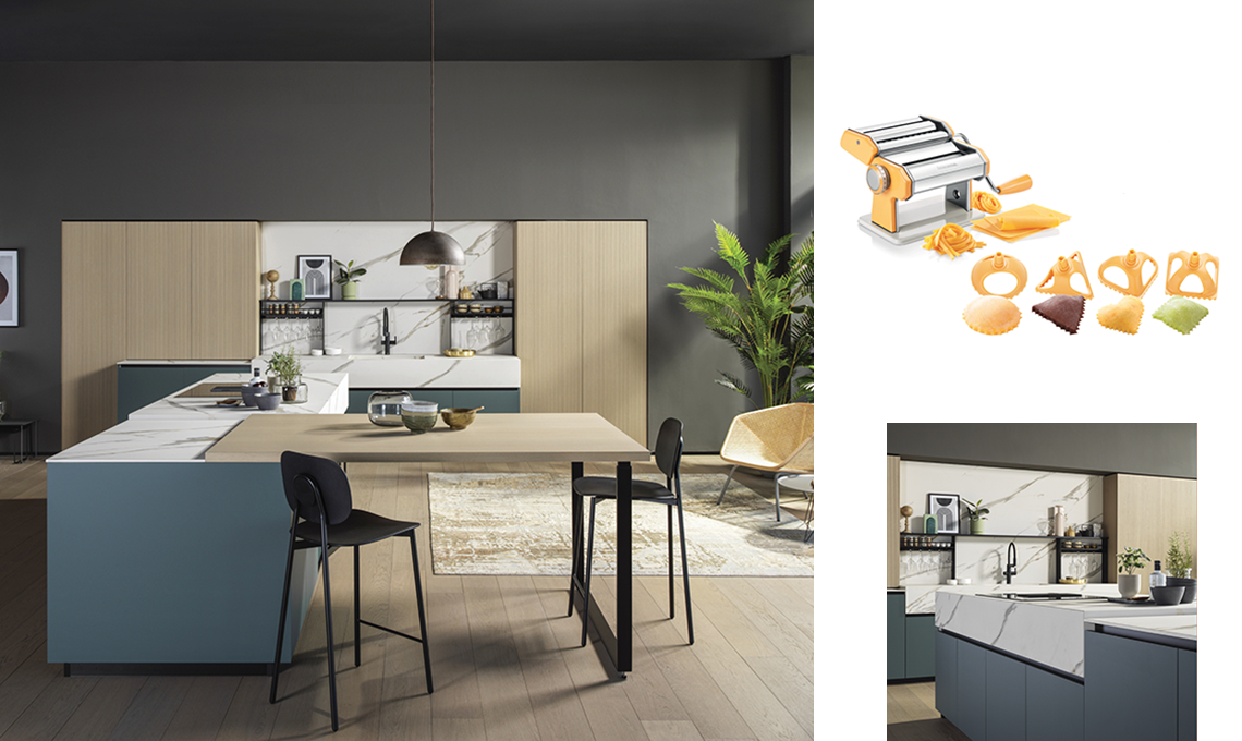 Cucina Kalì di [Arredo3], qui con allestimento Gaia. Macchina per la pasta fresca Delícia [cm 36x19x15h], set di Taglia Ravioli Delícia. Di [Tescoma].