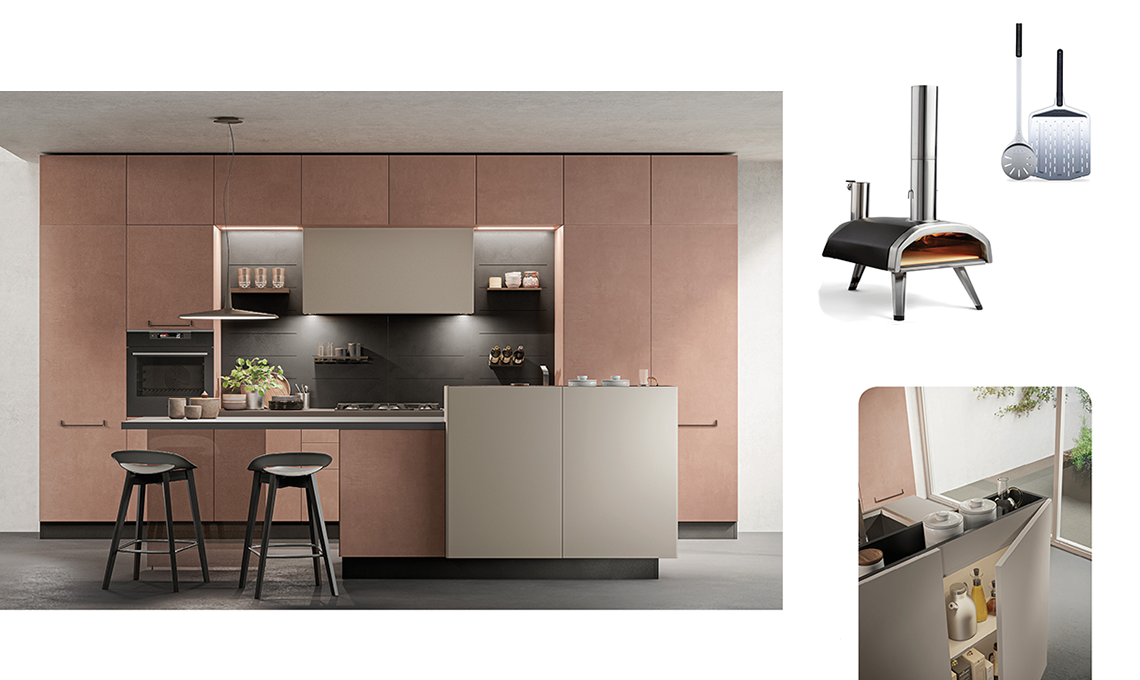 La boiserie Cover tra base e pensile, qui in finitura Grigio Selce è disponibile nella versione in appoggio o sospesa e permette l’inserimento di luci Led, mensole e portabottiglie. L’isola completa di bancone snack ha la base con modulo Break a spessore ridotto che consente, però, di aumentare lo spazio contenitivo e ha le ante che si aprono verso il living. In più, la vaschetta superiore è perfetta per contenere utensili e perfino le piantine aromatiche.