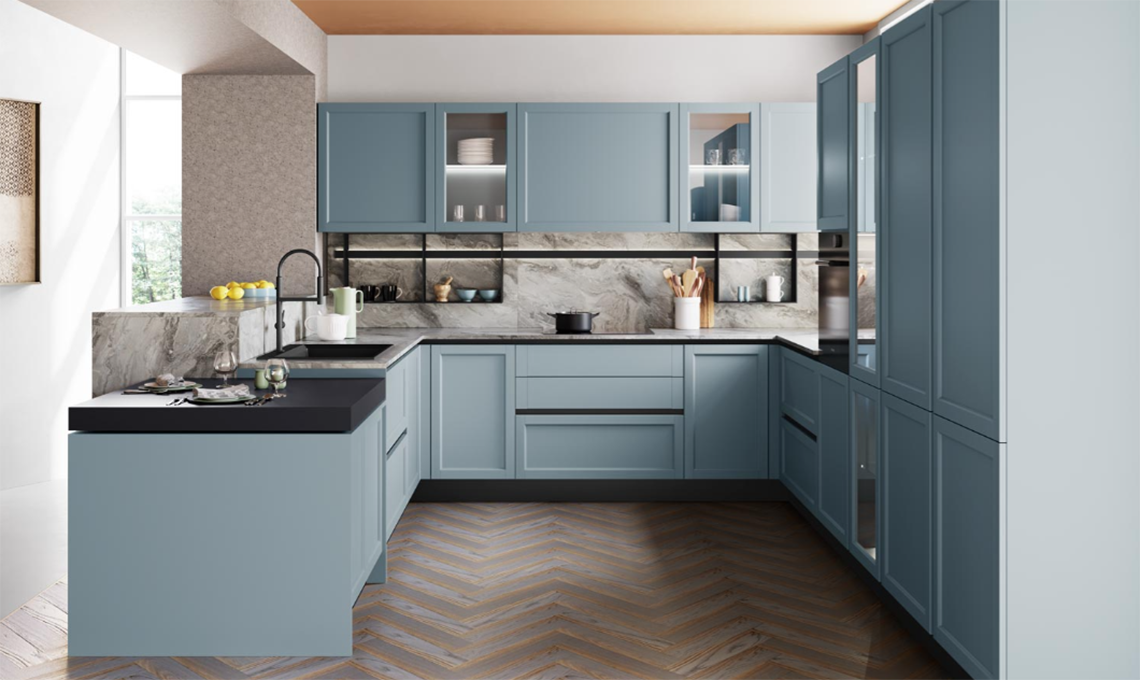 Contempo Neck di [Creo Kitchens] ha le ante in laccato azzurro Ottanio Opaco con gola in finitura ghisa, top in laminato H2 Bardiglio Plamky e sistema sottopensile Sign nero con luce integrata, canaline passacavi e ripiani dove riporre oggetti, spezie e utensili.