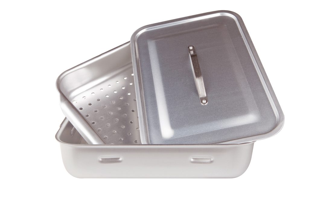 Brasiera in alluminio rettangolare con coperchio a souté e griglia [Agnelli, cm 40x26 €158,35].