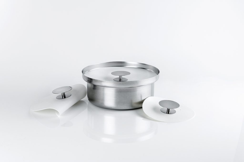 Innovative le pentole Stone+Work, da completare con manico sganciabile in noce e coperchio in silicone [KnIndustrie, qui casseruola diam. cm 20 da €65]