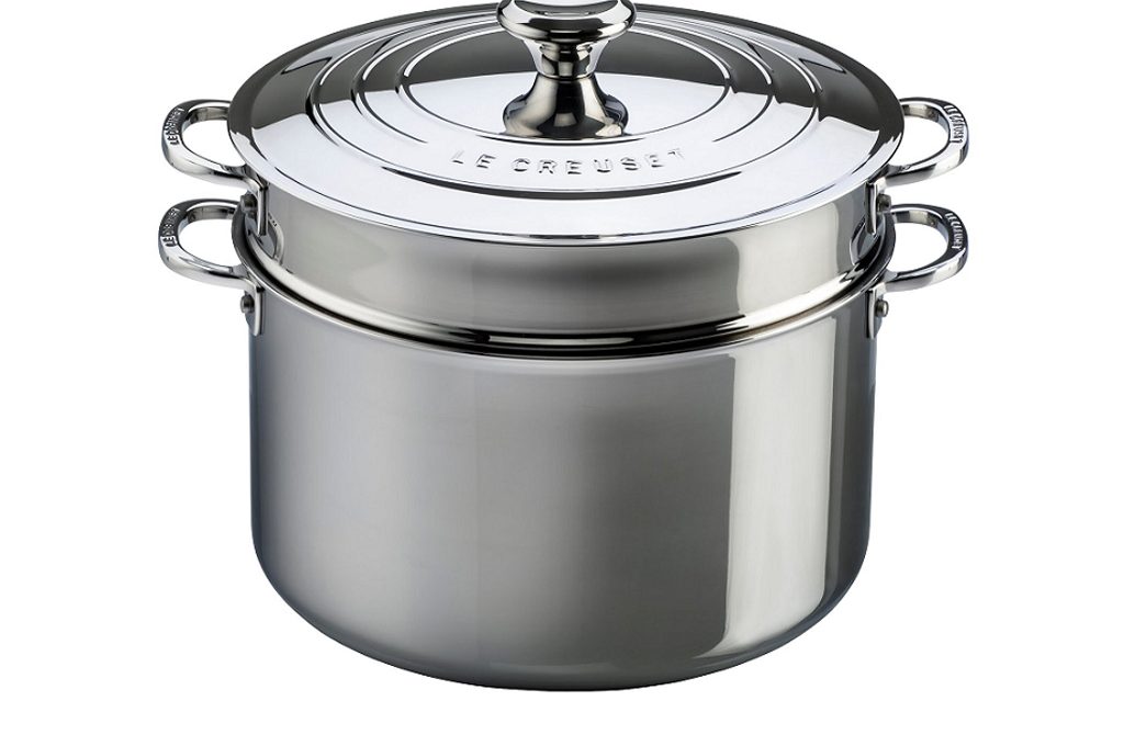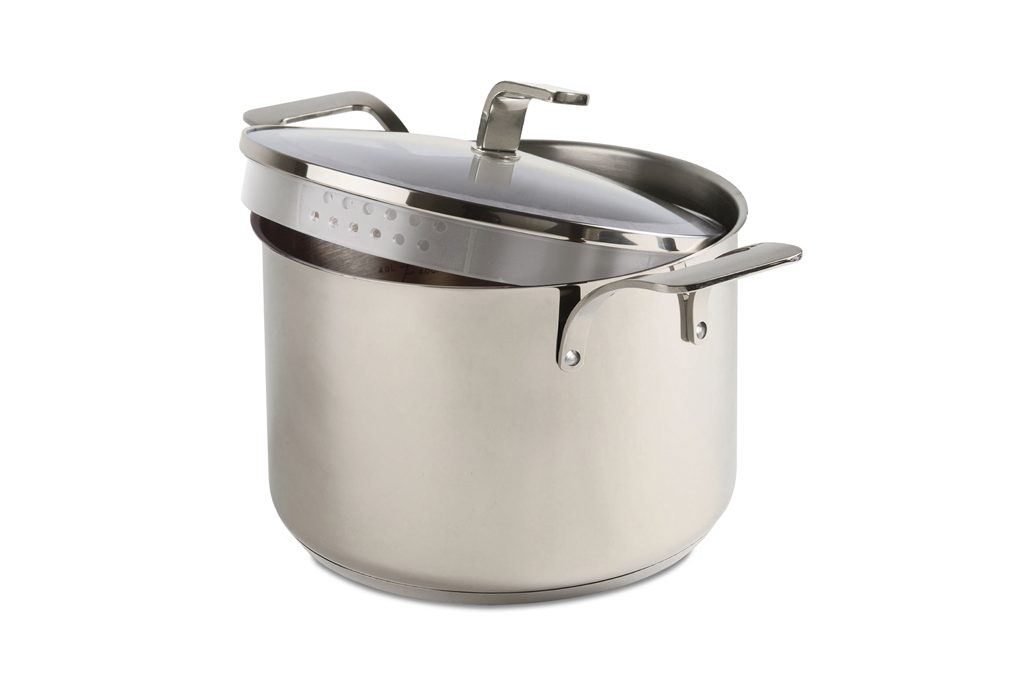 Le Creuset, noto marchio della ghisa smaltata, ha anche una linea di alta gamma in acciaio inox, qui pentola con scolapasta e coperchio [diam cm 28 €348]