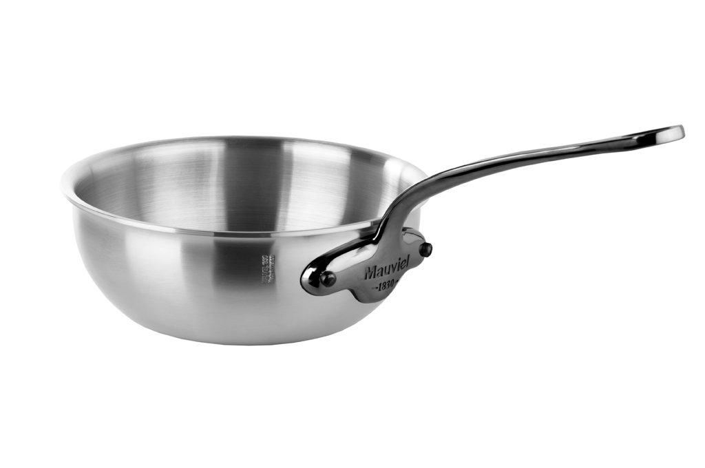 Dall'esperienza francese, la casseruola bombata per rosolare M'Urban Onyx fa parte di una linea di 10 pezzi in varie misure [Mauviel 1830, diam cm 24 €154]