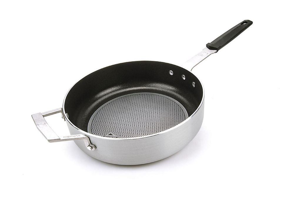L'interno in Fingres® della linea Pro Protection Base è inattaccabile. Qui, con maniglia per la presa e manico per far saltare il cibo [Moneta, diam cm 32 €79]